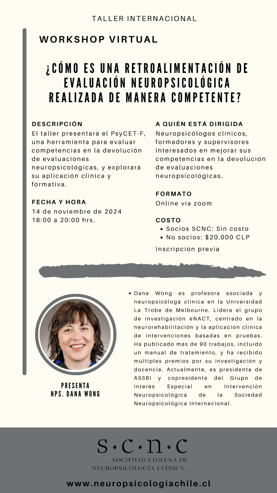 | 14 de noviembre de 2024 18.00 a 20.00 hrs Online | MPsych/PhD Dana Wong | ¿Cómo hacer la devolución de una evaluación neuropsicológica? |